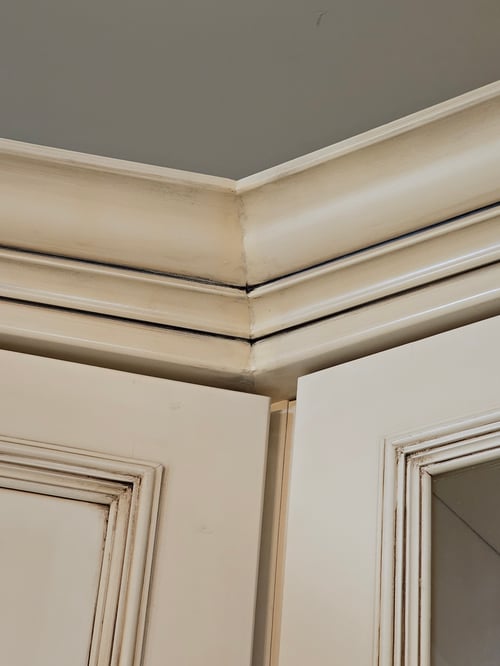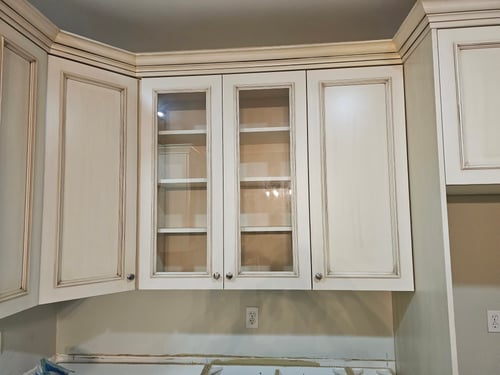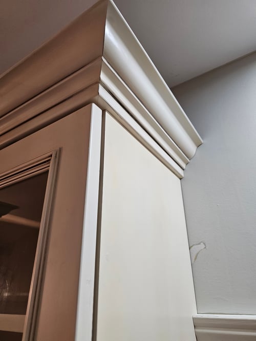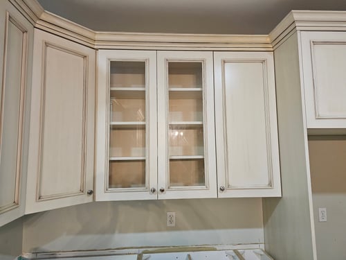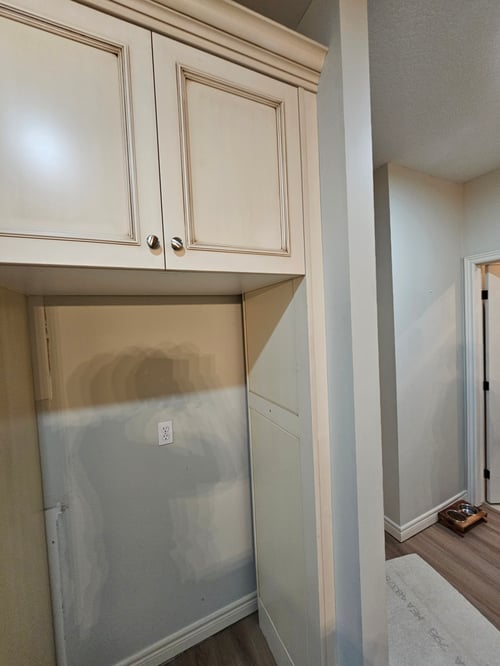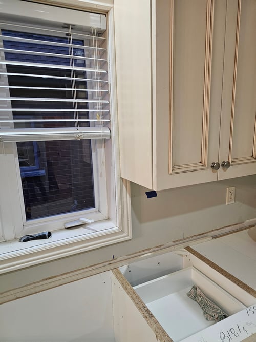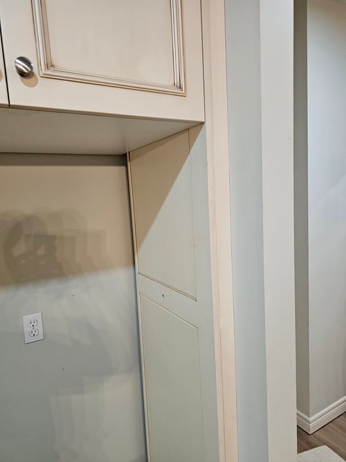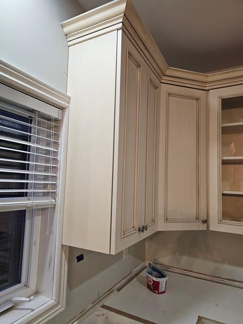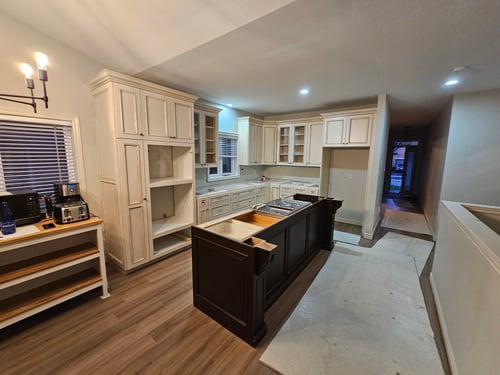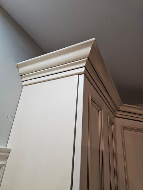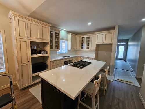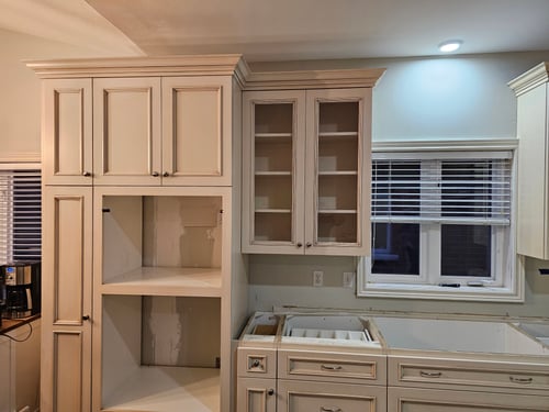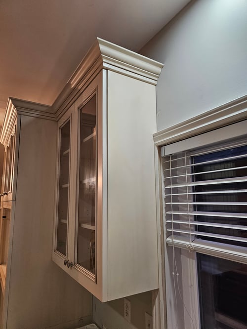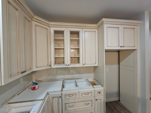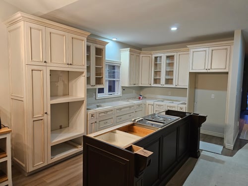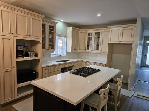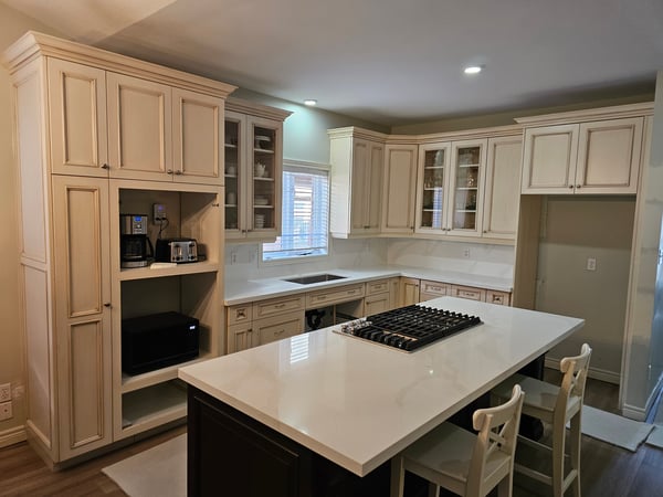 Transformed a showroom kitchen to fit the client's unique layout. Relocated cooktop to island and sink under window for improved usability. Added custom filler to create polished, built-in look for fridge. Adapted limited crown moulding materials to complete the design. Handcrafted light valances for a perfect finishing touch. In the end, the client was thrilled with their beautifully renovated kitchen, made possible by my commitment to a perfect result.